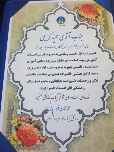 محمدی فرد مدیرکل کمیته امداد امام خمینی (ره) با اهدای لوح تقدیری از تلاشهای خیرخواهانه حمید کریمی و مرکز نیکوکاری اصناف و بازاریان البرز قدردانی کرد .