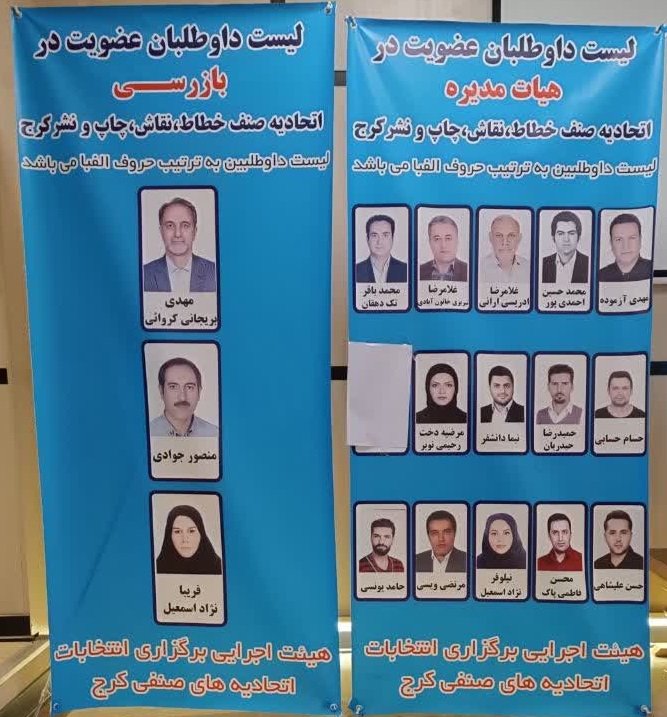 به استناد بند 10 ماده 15 آیین نامه اجرایی تبصره 3 ماده 22 و 23 قانون نظام صنفی (انتخابات هیأت مدیره و بازرس اتحادیه های صنفی ) انتخابات اتحادیه صنف خطاط،نقاش،چاپ و نشر شهرستان کرج در روز چهارشنبه مورخ 1402.10.20 از ساعت ۹ صبح لغایت 12 با حضور تعداد 231 نفر از مجموع 494 نفر برگزار شد.