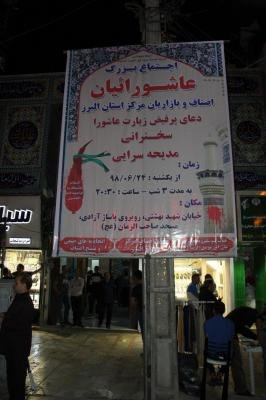 اولین شب ازمراسم سوگواری سرور و سالار شهیدان حضرت ابا عبدالله الحسین (ع) به همت اصناف و بازاریان استان البرز و برای هشتمین سال پیایی برگزار شد .قرائت دعای پر فیض زیارت عاشورا ،سخنرانی و اقامه عزا از بخش های مختلف این مراسم معنوی است .مراسم فوق از روز یکشنبه 24 الی 26 شهریور ماه سال جاری از ساعت 20:30 در مسجد صاحب الزمان (عج) واقع در خیابان شهید بهشتی ،روبروی پاساژ آزادی برگزار می گردد .