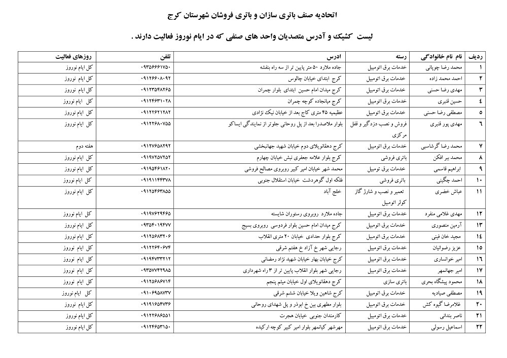 لیست کشیک و آدرس متصدیان صنف باتری سازان و باتری فروشان که در ایام تعطیلات نوروزی فعالیت دارند.