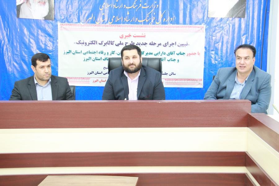 نشست خبری ویژه "تبیین اجرای مرحله جدید طرح ملی کالابرگ الکترونیک" با حضور جمعی از اصحاب رسانه استان البرز در اداره کل فرهنگ و ارشاد اسلامی استان البرز برگزار شد.